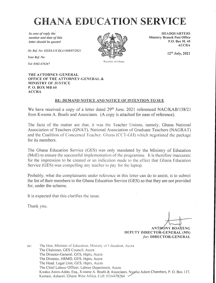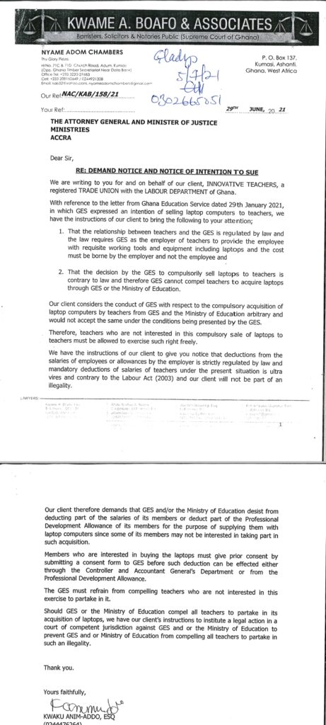 Innovative Teachers Union wrote a letter through their attorneys to GES on 29th June, 2021 to serve a notice to GES with the intention to sue the institution if they deduct money compulsory from teachers who do not want the substandard laptops.