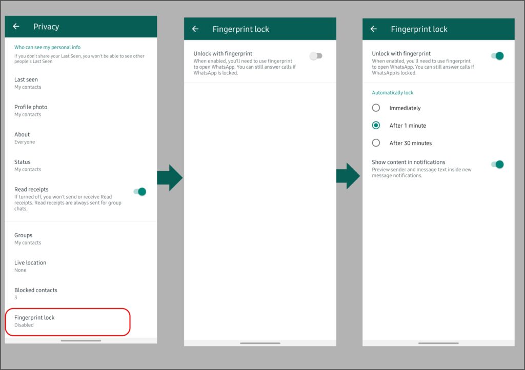 To enable Fingerprint lock, just head to Settings > Account > Privacy > Fingerprint lock. Turn on Unlock with fingerprint, and confirm your fingerprint.